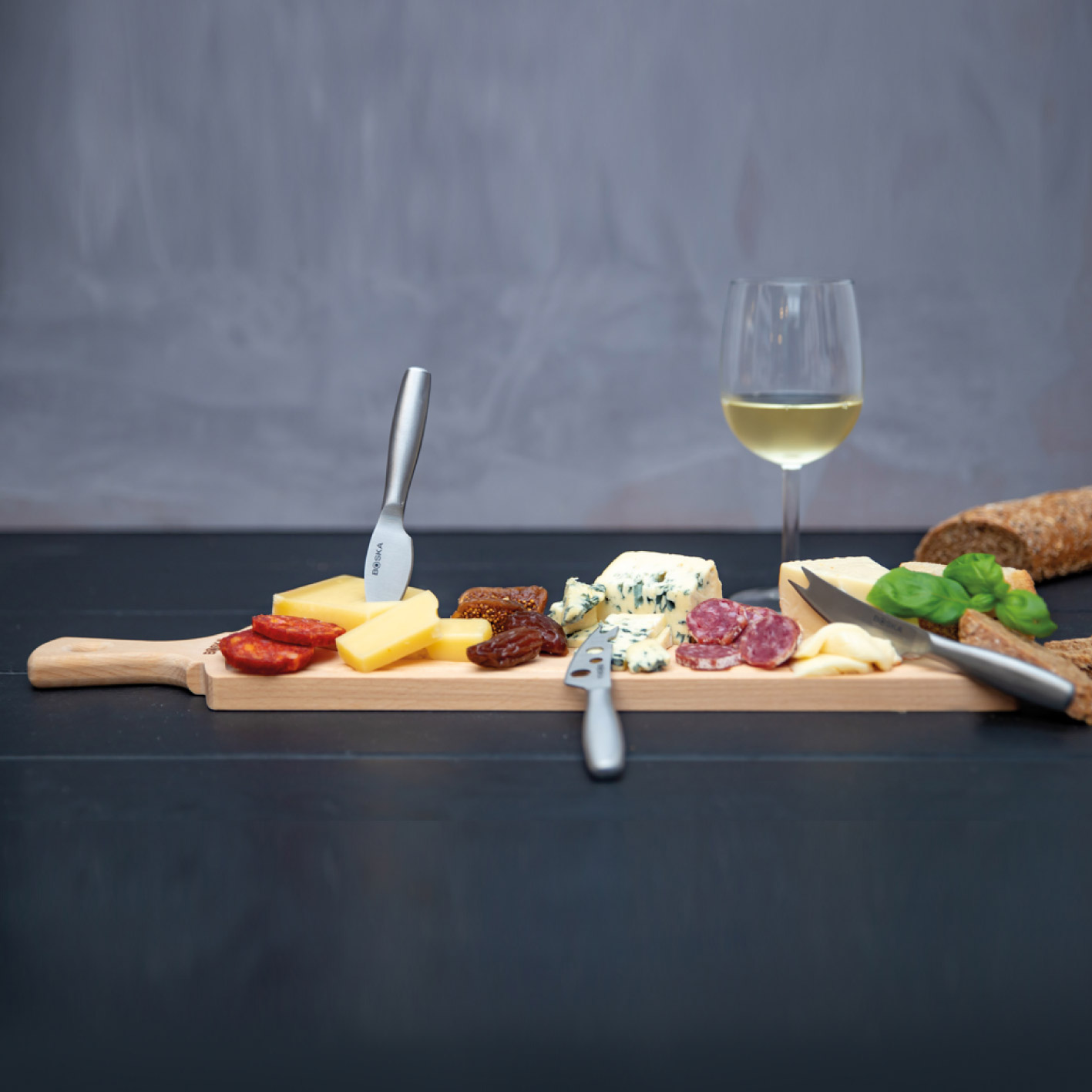 Ce set complet comprend une planche de service en bois de hêtre et trois couteaux Copenhagen.